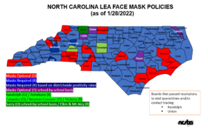 NCSBA continues to track local school boards’ mask policies as districts vote monthly on whether to modify their current policy (required by Section 10 of SB 654/SL 2021-130). Click here to access a chart of school board actions. If your school district changes its mask policy or you have corrections to the chart, please email information to Rebekah Howard at rhoward@ncsba.org.